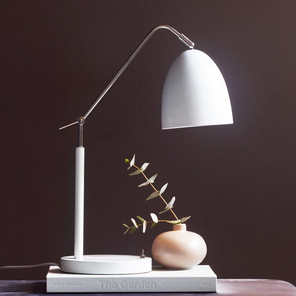 Funktionell Alexander bordslampa med kromdetaljer Satin mattlackerad metall och förkromad metall kombineras vackert i Alexander bordslampa för att skapa en tidlös ljuskälla med en extremt dekorativ, skandinavisk känsla. Den perfekt designade Alexander bordslampa kan justeras flexibelt med olika leder och ljusstrålen från den halvcirkelformade metallskärmen, som är vitlackerad på insidan, kan riktas i önskad riktning. Alexander bordslampa är utrustad med en 150 cm lång kabel och den känsliga vippbrytaren i form av en krompläterad spak är integrerad direkt i basen.