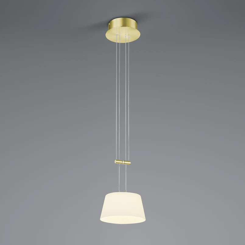 Omsorgsfullt utformad Conus LED-pendellampa med skärm i opalvitt glas, enkel belysning, dim till varm Den enkelstrålande Conus LED-pendellampan kännetecknas framför allt av sin omsorgsfullt utformade design. Fyra kablar hänger från aluminiumskärmen, på vilken en stång, också tillverkad av aluminium och målad för att matcha skärmen, är fäst. Den koniska skärmen, som ger Conus dess namn, är tillverkad av opalvitt glas, vilket ger ett något diffust ljus på sidorna. Det varmvita ljuset alstras av lysdioder med god färgåtergivning och kan dimras externt med en triac. Om ljusintensiteten minskar, minskar även färgtemperaturen och blir varmare (dim till varm), så att ljusstämningen kan anpassas individuellt och Conus pryder även taket som ett dekorativt element när den är avstängd. Den är handgjord i Tyskland av belysningstillverkaren BANKAMP.