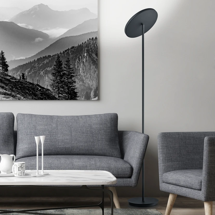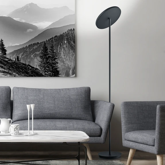 Solid LED-golvlampa med vridbar skärm - dimbar Denna golvlampa är något alldeles speciellt: mycket minimalistisk i utseendet, ultramodern när det gäller ljusteknik. Den är utrustad med kraftfulla lysdioder - fördelade över en stor yta av den skivformade skärmen - som genererar ett högt ljusflöde och avger ett behagligt varmvitt ljus som skapar en atmosfärisk ljusstämning. En touchdimmer är inbyggd i ramstången, som kan användas för att anpassa ljusstyrkan till individuella krav. Färgåtergivningsindexet anges med det höga värdet CRI>95, vilket innebär att konturer och färger i omgivningen verkar mycket levande. Skärmen kan roteras så att ljusriktningen kan justeras efter behov.