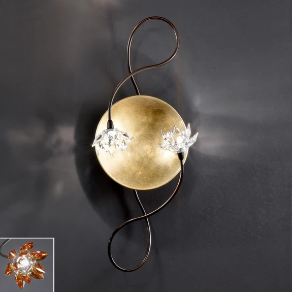 2-lampig FIORELLA vägglampa med blommiga elementMed sina förtrollande blommor är FIORELLA vägglampa ett vackert konstverk för väggen. Blommornas lyster förstärks ytterligare av den guldfärgade reflexplattan. De svepande linjerna hos metallarmarna i rost antik bidrar också till den tilltalande designen hos FIORELLA vägglampa. Den som älskar det ovanliga kommer garanterat att hitta rätt med denna lampa och kan därmed skapa en spännande extra belysning i sin bostad.