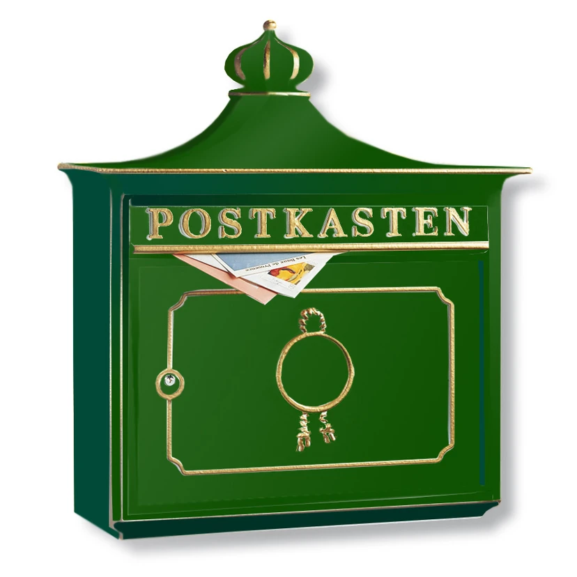Exklusiv brevlåda av gjuten aluminium Bordeaux med nostalgisk känsla Bordeaux är tillverkad av gjuten aluminium i en exklusiv, utsmyckad design och är en riktig pärla på varje husvägg. Den guldfärgade inramade poststämpeln på framsidan är ett absolut blickfång. Den iögonfallande texten lämnar heller ingen tvekan om vad föremålet ska användas till. Bordeaux är helt väderbeständig och erbjuder plats för massor av post. Insticksformat DIN C4.