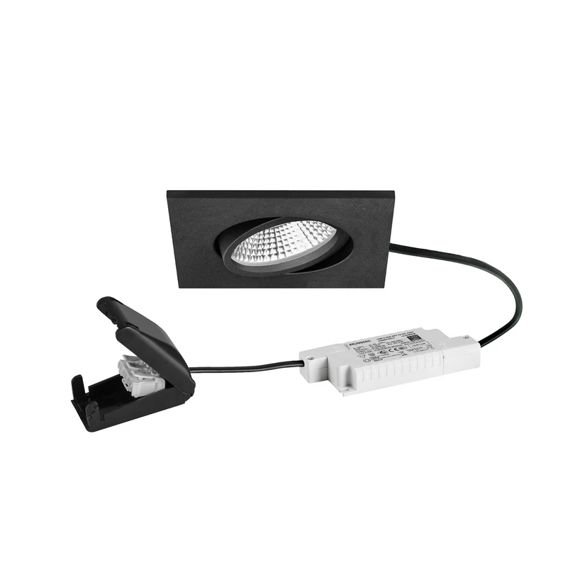 BB25 infälld LED-downlight med dimbart LED-drivdon och anslutningsbox Denna fyrkantiga infällda LED-spotlight består av en rund, svängbar spotlight i ett fyrkantigt hus, ett LED-drivdon (RC) som kan dimras med en bakkantsfasdimmer och en anslutningsbox. Downlighten, som kan vridas 15° runt om och har en hög kapslingsklass IP5, kan användas för att belysa fuktiga rum som badrum, wellnessavdelningar, bastur etc. Strålkastaren är utrustad med en varmvit LED i en silverreflektor med rotationssymmetrisk djup ljusfördelning bakom en transparent plastkåpa och avger ljus med en spridningsvinkel på 36°. Utrustad med monteringsfjädrar för verktygsfri montering - maximal takhöjd 1,7 cm - inklusive elektronisk driftdon, bakkant dimbar (RC) - med kopplingsbox, 3-polig för genomkoppling - tillåten omgivningstemperatur - 20 till 25 °C - får inte täckas med värmeisolerande material - hög IP65-skyddsklass - kan svängas 15°