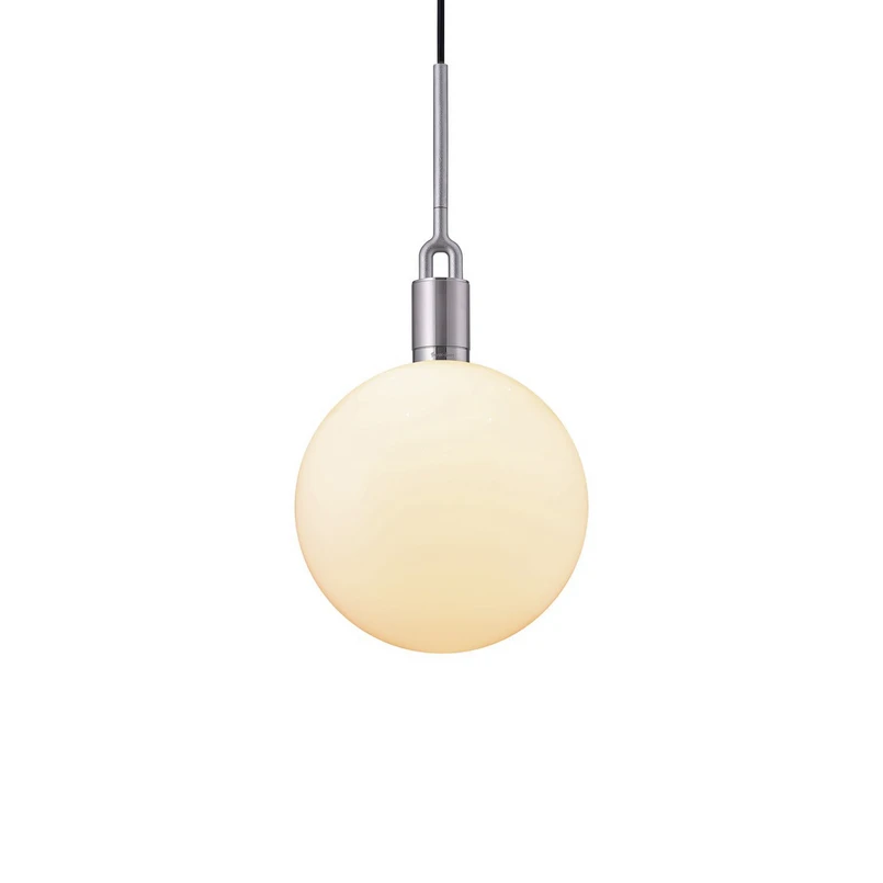 Forked hängande lampa i metall med munblåst sfär i opalglasForked är en hängande lampa som består av en upphängning av högkvalitativ, gjuten och maskinbearbetad metall med Buster Punchs karakteristiska linjära diamantskurna rynkade mönster. Den har också handgjorda detaljer i uttaget och en handblåst sfär av opalglas och passar in i alla interiörer. På insidan av klotet finns ett E27-fäste och en LED-lampa med varmvit ljusfärg ingår. Pendellampan Forked är en produkt från det engelska belysningsmärket Buster Punch, som grundades i London 2013. Företaget tillverkar lampor, armaturer och inredning av högkvalitativa metaller. Pendellampan Forked återspeglar också tillverkarens kärlek till solida metaller i sin design. I kombination med den handblåsta klotet av opalglas skapas en pendellampa som lämpar sig för att belysa de mest varierande områden, antingen enskilt eller i flera armaturer, och som avger ett mycket behagligt, bländfritt ljus runtomkring.