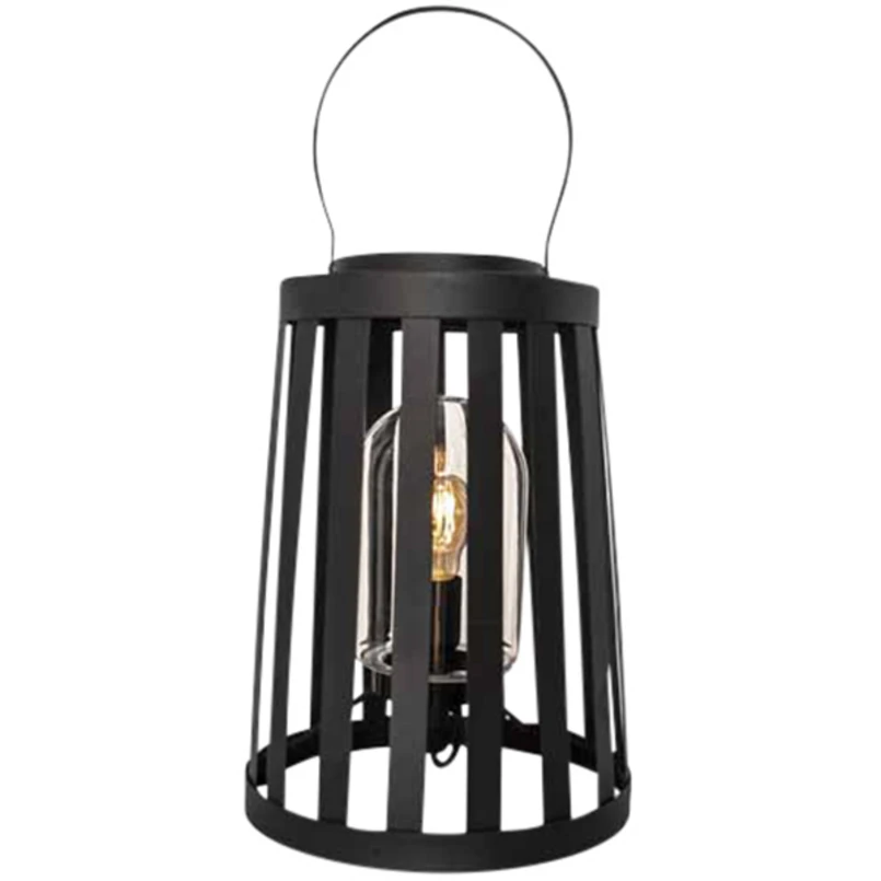 Delphia terrasslampa för dekorativ utomhusbelysning Metallkroppen på Delphia-lampan är en modern version av den klassiska lyktan. Ljuset sprids effektivt till omgivningen genom de vertikala stagen och du kan skymta ljuskällan (E27, ingår ej). Tack vare den 5 meter långa kabeln kan armaturen placeras relativt enkelt var som helst på uteplatsen eller balkongen. Delphia kan användas som golv- eller bordslampa både inomhus och utomhus.