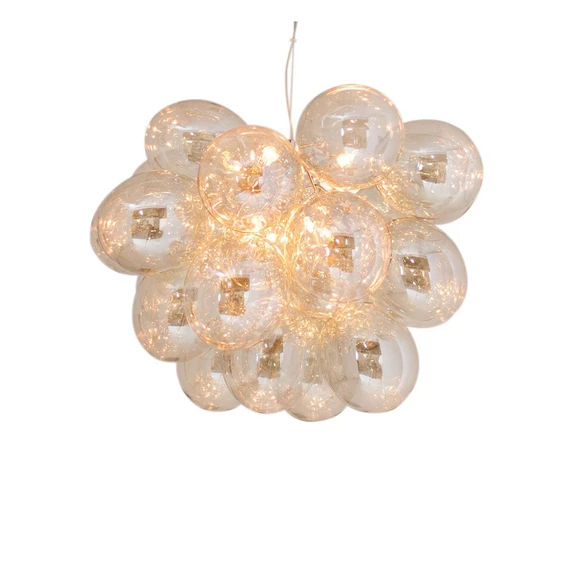 Glaskulor som såpbubblor: Gross Grande pendellampa Skuggan på Gross Grande pendellampa ser ut som en samling av många såpbubblor eller ett kluster av flera små ballonger, vilket faktiskt inte kan beskrivas som en skugga i klassisk mening. Armaturen är ett komplett konstverk i sig, med ljuskällorna skickligt dolda mellan glassfärerna. Totalt åtta socklar för G9-lampor ger belysning och samtidigt det glitter och skimmer som denna pendellampa utstrålar i rummet.
