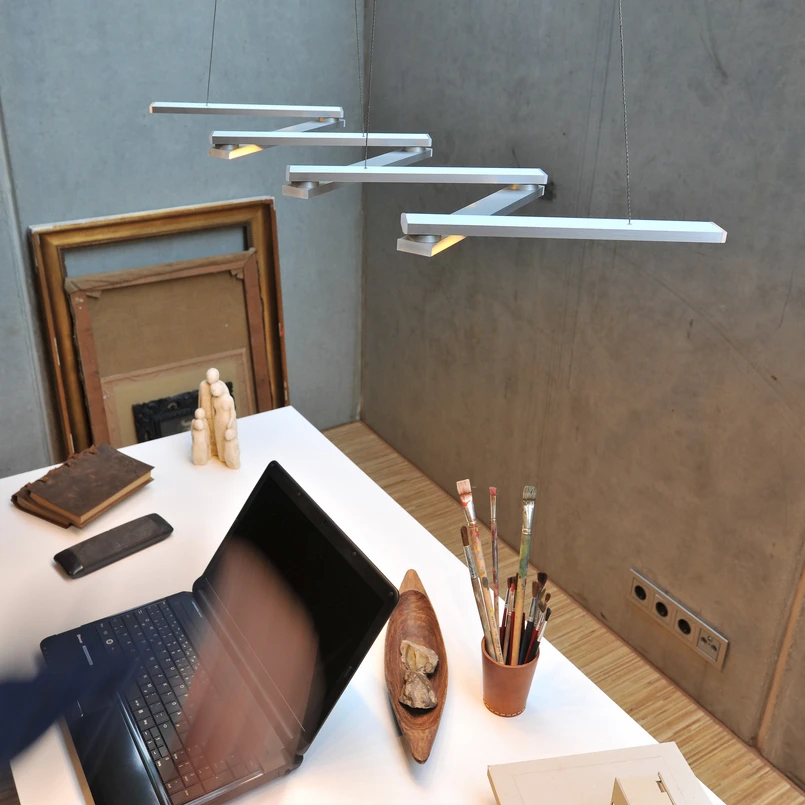 Pendellampan Nastro från den tyska tillverkaren BYOK består inte av en kontinuerlig profil, utan av sju aluminiumelement som kan vridas tillsammans i ett horisontellt plan. Höjdjusterare på de kopparflätade kablarna gör det också möjligt att justera den totala höjden eller luta elementen. Denna konstruktion gör det möjligt att skapa individuella strukturer - i linje, böjda eller cirkulära. De varmvita lysdioderna är integrerade i elementens undersidor, vilket ger en direkt belysning som kan justeras kreativt för att passa in i omgivningen. Detta stöds ytterligare av den externa dimbarheten via fasdelen. Ljusets goda färgåtergivning och tillverkningen i Tyskland enligt de högsta kvalitetsstandarderna resulterar i en LED-pendelarmatur av absolut hög kvalitet.