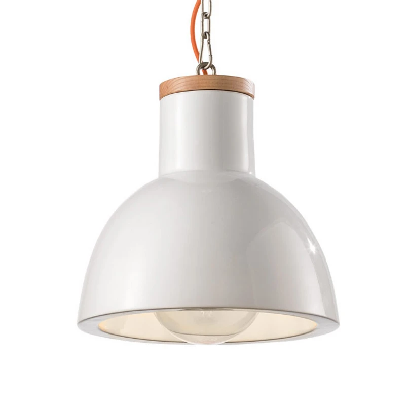Pendellampa C1781 av keramik och trä för enkel elegans i vardagsrummet Formgivarna av pendellampan C1781 har följt den nordiska modellen och fokuserat på minimalism och en harmonisk materialmix av högkvalitativ keramik och trädetaljer. Lampans enkelhet kombineras med ett blickfång i form av en orangefärgad strömkabel, vilket gör att pendellampan C1781 kan integreras perfekt i olika inredningsstilar. En matchande ljuskälla sätts in i den keramiska skärmen och avger ljuset nedåt för optimal belysning av till exempel matbordet eller en hall. En träring av ask med ekfinish är placerad vid skärmens övre kant. Den italienska tillverkaren tillverkar sina lampor till 100 procent Made in Italy med traditionella tillverkningsmetoder som har gått i arv från generation till generation.