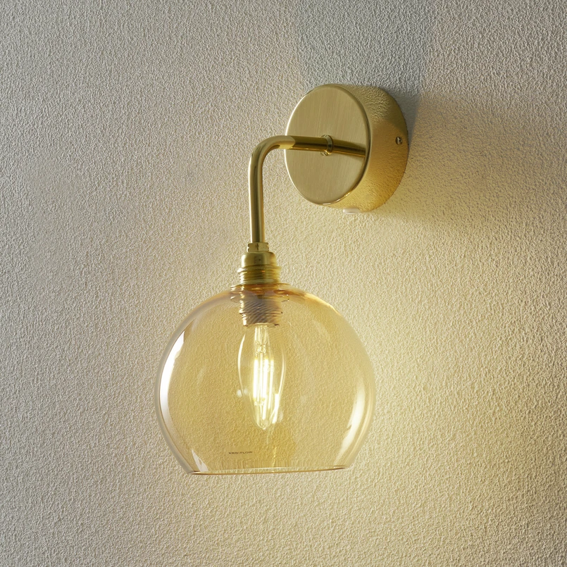 Rowan vägglampa från EBB & FLOW (Danmark) är en ljuskälla som ger stämningsfull extrabelysning på ett förtrollande sätt. Väggfästet och den nedåtriktade ljusarmen är tillverkade av guldfärgad metall och bildar en dekorativ kontrast till den runda, nedåtriktade glasskärmen. Ljuset som faller i alla riktningar genom den transparenta glasskärmen framhäver också guldtonen. Skärmen är tillverkad av munblåst glas. Varje lampa är unik; på grund av tillverkningsprocessen kan det förekomma små variationer såsom små luftinneslutningar etc. - Kan kombineras med många inredningsstilar