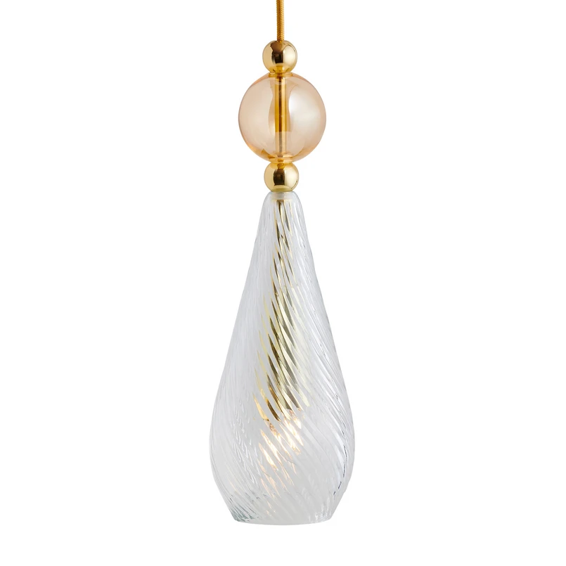 Elegant kombinerad: Smykke pendellampa med dekorativ sfär av handblåst glas Den lätt böjda skärmen på Smykke pendellampa är tillverkad av kristallglas med ett integrerat virvelmönster. Genom glasets transparenta yta kan man inte bara se metallstången, som går djupt in i glaset, utan även ljuskällan som sitter i sockeln (ingår ej). Det övergripande utseendet förstärks ytterligare genom valet av en attraktiv glödlampa, som finns som tillbehör. Ytterligare dekorativa element är de två små metallkulorna och den något större dekorativa kulan av handblåst glas - utrustad med en rund textilkabel - design: Susanne Nielsen - en högkvalitativ designprodukt från det danska designmärket EBB & FLOW