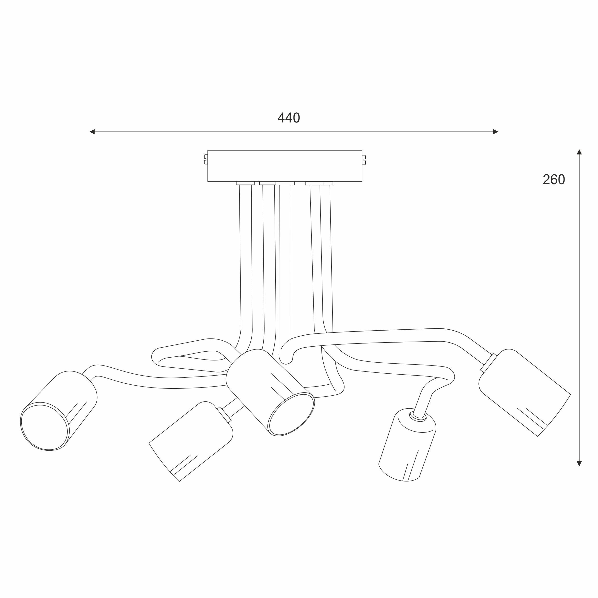 Svart Joiy-taklampa med fem spridda uttag i ett trähus - tillverkad i Europa Den femlampiga Joiy-taklampan har ett modernt och lekfullt utseende med sina vridna armar av svartlackerat stål. De är riktade åt olika håll och har varsitt lamputtag med ett hölje av ljus ek, vilket ger Joiy-taklampan en naturlig touch. Designen utan skärm kan kompletteras med dekorativa glödlampor.