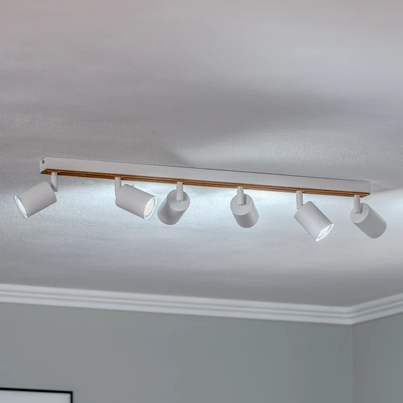 Envostar Tino takspotlight förenar elegansen hos vitt stål med den naturliga värmen hos ljust trä. Denna armatur med 6 lampor erbjuder en flexibel belysningslösning för olika bostadsutrymmen såsom vardagsrum, hall och sovrum. Dimbarheten via en extern dimmer gör det möjligt att individuellt anpassa ljusintensiteten för att skapa önskad atmosfär.