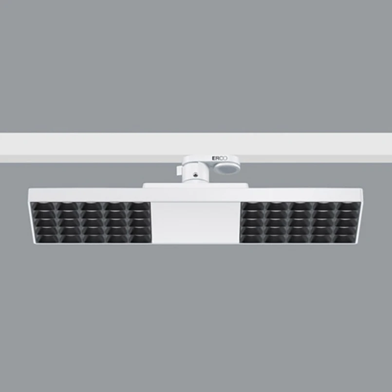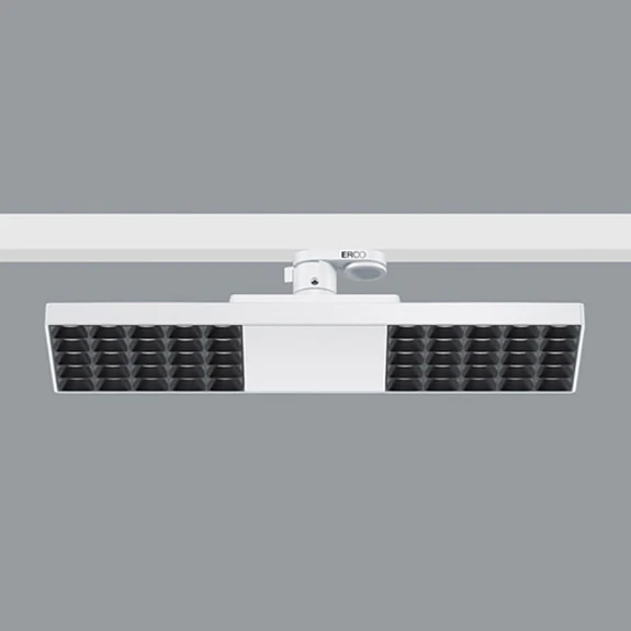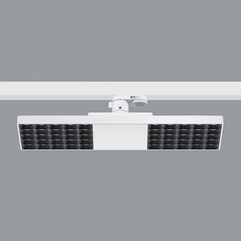 Jilly LED rasterarmatur från ERCO för styrning via Casambi-appen för strömskenor 230 V 3-fas - 15 W LED, ljusfördelning oval wide flood (83° / 62°) LED-skenaarmaturen Jilly är ett flexibelt val för belysning av arbetsplatser på kontor. Det speciella linssystemet av optisk polymer och avbländningsrastret ger inte bara god avbländning utan även en bred, oval ljusfördelning. I kombination med den 360° vridbara strömskenans adapter kan ljuset därför anpassas optimalt för t.ex. en dubbelarbetsplats som är placerad på längden eller tvären i förhållande till strömskenan. Jilly är Bluetooth-aktiverad och kan styras med Casambi-appen på en surfplatta/smartphone. - Bländskydd: plast, svartlackerad - Med strömskenor för ERCO 3-fas strömskena, Hi-trac 3-fas strömskena och 1-fas punktuttag - Standardkonform avbländning för VDU-arbetsplatser: UGR < 19 - ansluten effekt: 18 W - med ERCO Casambi-driftdon - anslutning till smartphone/surfplatta via Bluetooth - kopplingsbar, dimbar och kan integreras i scener via Casambi-appen (finns kostnadsfritt för iOS och Android) - kan styras med andra Casambi-kompatibla produkter