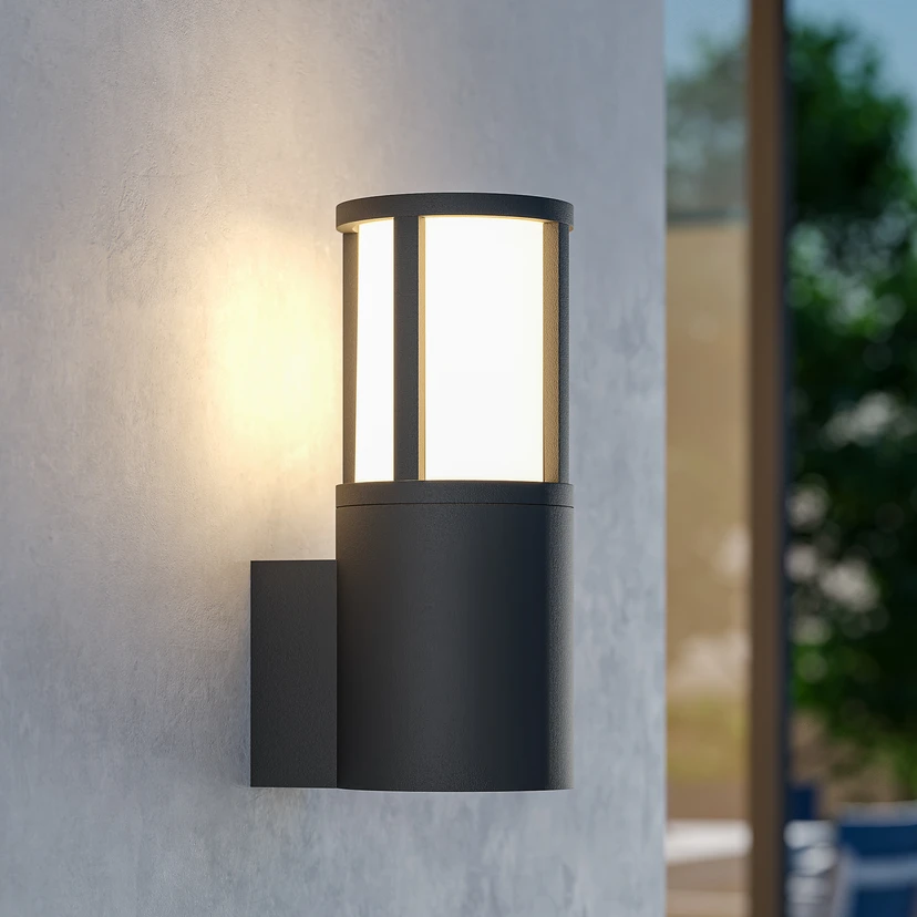 Cylindriskt utformad Facado II utomhusvägglampa i mörkgrå metallic Facado II är en modern utomhusvägglampa som lyser upp utomhusområdet från alla håll. Lamphuset i aluminium har en cylindrisk form och en mörkgrå metallic-finish. Ljuset från lampan E27 sprids runt om genom ett hölje av polykarbonat - Kapslingsklass: IP65