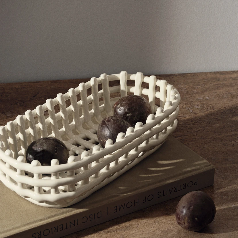 Keramisk korg i oval form från ferm LIVING tillverkad av handgjord, glaserad keramik De handgjorda korgarna från Ceramic-serien från ferm LIVING framkallar den välbekanta känslan av vävda behållare och för över traditionellt korgmakeri till keramik. Den multifunktionella designen kan användas som blomkruka, fruktskål eller som en dekorativ mittpunkt i ett rum. De handformade och konstfullt ojämna korgarna är var och en unika. Produktanmärkning: Denna produkt är handgjord - det kan förekomma variationer i förhållande till produktfotot. Skötselråd: Torka av med en fuktig trasa.