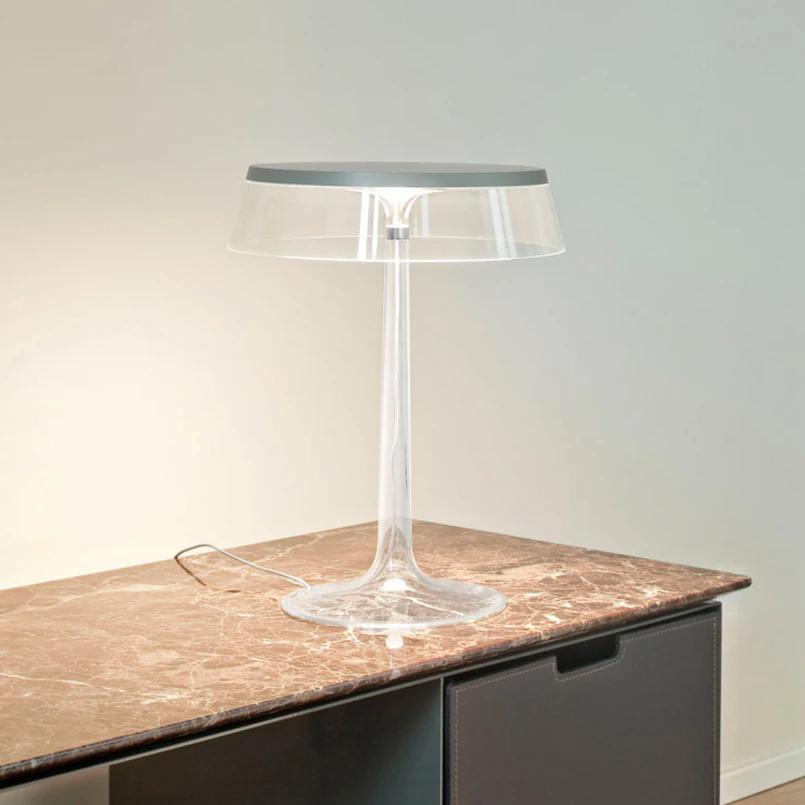 Designerbordslampan Bon Jour skapar inte bara en mysig ljusatmosfär i det moderna vardagsrummet, utan sätter också mycket dekorativa accenter. Den är tillverkad av formsprutad, genomskinlig PMMA-plast och har en matt kromad yta på ovansidan. Ljuskällan, som består av varmvita lysdioder, är dold under lampskärmen, som också är genomskinlig. Lysdioderna är utrustade med den revolutionerande Edge-Lighting-tekniken, som drar maximal effektivitet ur lysdioderna. Dessutom ger de installerade lysdioderna ett mycket jämnt och diffust ljusmönster, vilket de flesta tycker är mycket behagligt. Den dimmer som är integrerad i kabeln gör att ljusstyrkan kan varieras kontinuerligt från 100-10 %, enligt önskemål.