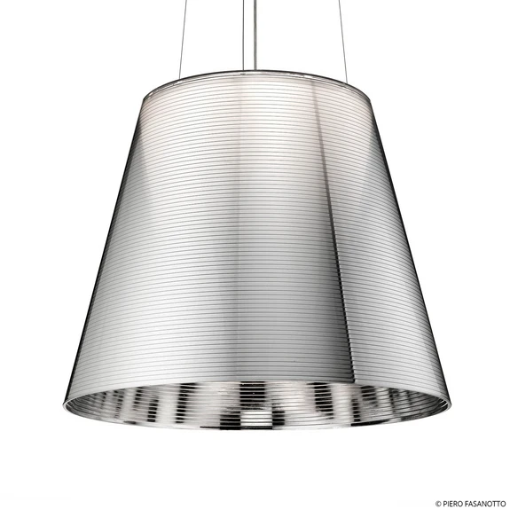 Pendellampan KTribe, som redan är slående på grund av sin stora skärmdiameter, är ett absolut blickfång. Den ingår i en serie häng-, vägg-, bords- och golvlampor som Philippe Starck har designat för det italienska belysningsföretaget FLOS.