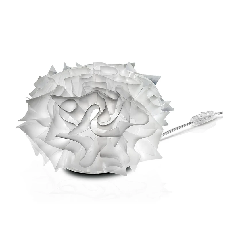 Förtrollande designbordslampa Veli Couture Designbordslampan Veli Couture ser mycket känslig ut och som om den vore gjord av fint tyg eller papper. Men den är varken gjord av tyg eller papper, utan av en speciell plast som heter Opalflex®, som har utvecklats och patenterats av armaturtillverkaren Slamp. Den är mycket dekorativ på ett bord eller en byrå och skapar en effektfull ljuseffekt med unika ljus- och skuggspel i omgivningen. Bordslampan tänds och släcks med strömbrytaren som är integrerad i matningskabeln. Bordslampan som tillverkas i Italien av den kända belysningstillverkaren Slamp är utrustad med ett E14-uttag i den bulbformade skärmen och kan endast utrustas med LED-lampor (ingår ej). Tillverkaren rekommenderar att du använder en LED-lampa med glödtrådsteknik.