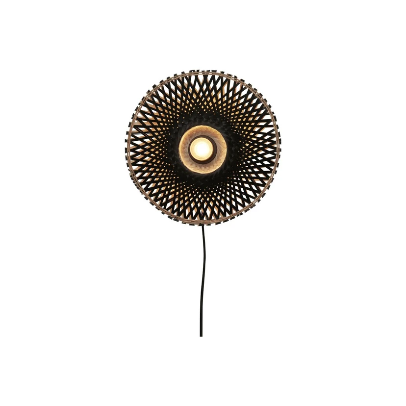 Rund vägglampa Kalimantan med kabel och strömbrytare Denna runda vägglampa är ett unikt belysningselement som är tillverkat av naturmaterial och behåller samma naturliga färg. Kalimantan imponerar med sin vävda skärm av flexibel, robust bambu, som anses vara ett hållbart material. Växten kan skäras av om och om igen och växer tillbaka mycket snabbt, den producerar också mycket syre och dess struktur är imponerande. Alla stag i mönstret löper in i mitten av den runda armaturen, där en cirkulär fördjupning är integrerad. Den ljuskälla som ska användas sitter i detta urtag, är helt synlig och avger ljuset direkt. Ljuset går även ut i armaturhuset, där det sedan lyser genom springorna och skapar ett unikt ljusmönster i rummet. Kalimantan ansluts via en plug-in-kabel med en integrerad strömbrytare för enkel drift. Good & Mojo är ett varumärke som tillhör det nederländska företaget It's about Romi, som började arbeta med hållbara material 2010. Detta projekt gav upphov till ett eget hållbart varumärke, Good & Mojo, som lanserades på marknaden 2016. Företaget är också engagerat i sociala projekt och annonserar om att ett träd planteras för varje såld produkt.