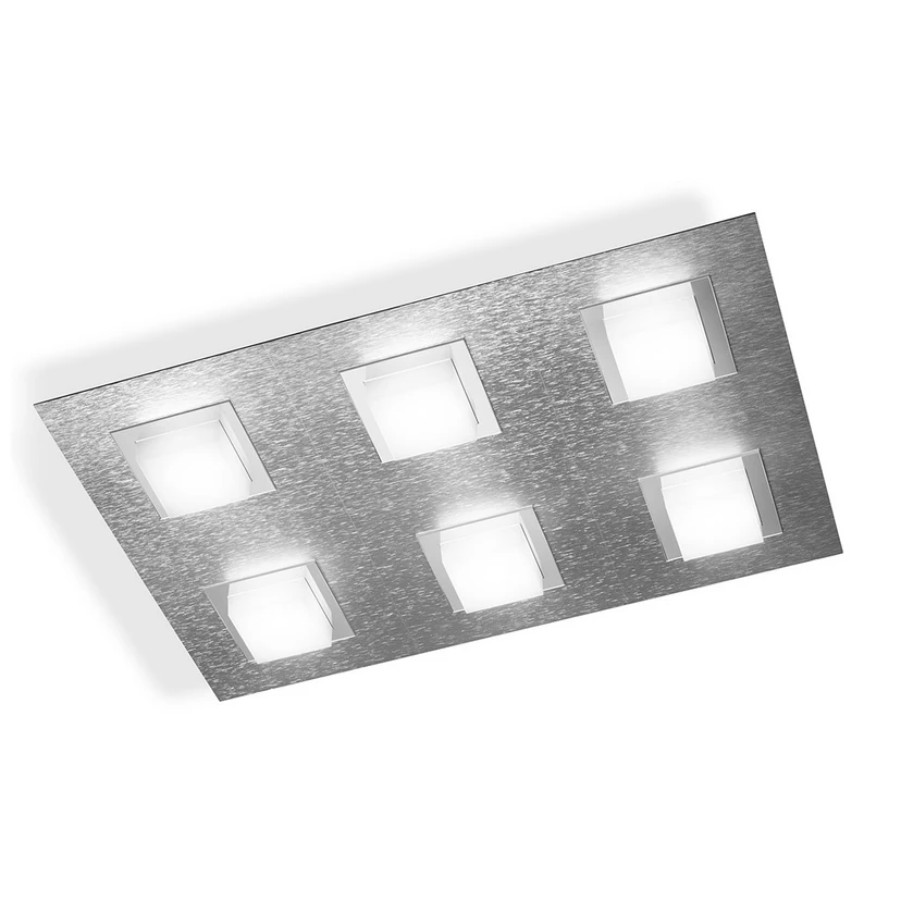 Basic LED-taklampa - modern rumsbelysning "Made in Germany" Högkvalitativt aluminium, mjukt skimrande, borstat och anodiserat, kombineras med innovativ, högpresterande ljusteknik. Basic LED-taklampan innehåller totalt sex LED-moduler som övertygar med sitt varmvita ljus och höga färgåtergivning. Detta ger en ljusstyrka på 3 120 lumen som lyser upp alla rum bländfritt och garanterar tillräcklig belysning. LED-lamporna är placerade under kuber av satiniserad akryl, som är monterade i ett symmetriskt arrangemang på aluminiumplattan. Det moderna konceptet för Basic LED-taklampan kombineras med högkvalitativ produktion i Tyskland och användning av LED-teknik med lång livslängd. Den resulterande armaturen från GROSSMANN är en kvalitetsprodukt för framtidsorienterad belysning. Tack vare sin enkla men eleganta design är Basic LED-taklampan också en riktig allroundlampa: den kan användas i nästan alla inredningsstilar och i nästan alla bostadsutrymmen.