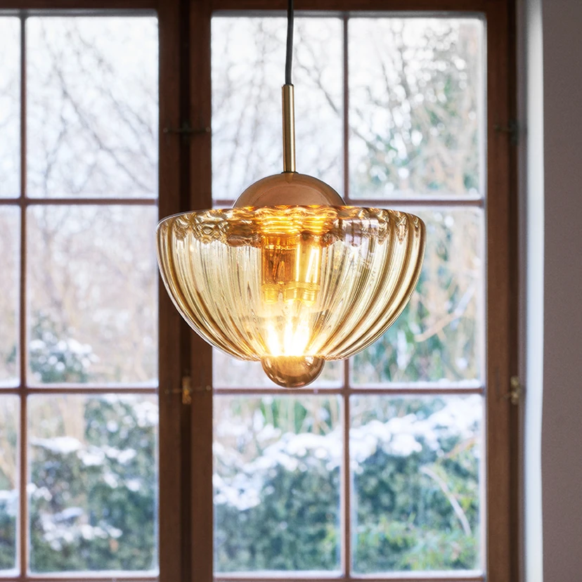 Lotus-pendellampa av handblåst glas Som namnet antyder är Lotus-pendellampan inspirerad av den vackra och symboliska lotusblomman. När lampan tänds skapar det korrugerade handblåsta glaset ljusstrålar som är formade som blommans blommande blad. Och tack vare det handgjorda glaset är dess struktur lika individuell. Inuti skärmen finns en sockel för en E27-lampa (ingår ej). För den perfekta looken rekommenderar vi en lampa med spegelhuvud och en diameter på 6 cm (se tillbehör). Obs: Levereras utan den ljuskälla som visas.