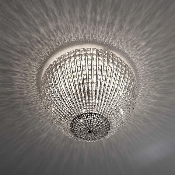 Helios halvcirkelformad taklampa för en fantastisk ljusupplevelse Den glittrande, sfäriska taklampan Helios imponerar med sina unika ljuseffekter. Dessa förstärks av ett litet avstånd till taket, eftersom ljuset tar sig igenom det och lämnar fascinerande spår i taket i form av intressanta mönster. Men Helios kan ännu mer. De högkvalitativt slipade kristallerna bryter det infallande ljuset och reflekterar det på ett förtrollande sätt tillbaka till omgivningen. Taklampan imponerar i mottagningsrum och hallar där det krävs en imponerande ljuskälla. Helios ger privata rum en elegant, nästan magnifik touch och förtrollar omgivningen med sitt fantastiska utseende. Högkvalitativ metall med polerad nickelfinish utgör basen för kristallen och gör taklampan till ett genomgående elegant designobjekt.