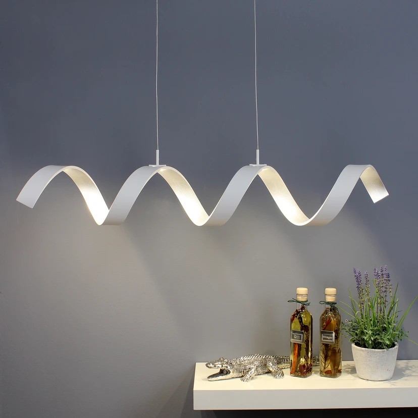 Modern LED-pendellampa Helix som vit och silverfärgad spiral Effektiv rumsbelysning och elegant, modern design går hand i hand med pendellampan Helix. Dess LED-lampor är integrerade i de övre delarna av armaturhusets silverfärgade insida. Deras ljus avges direkt nedåt, men reflekteras också uppåt av spiralen, vilket framhäver silverfinishen på ett skickligt sätt. På utsidan är Helix vit - det perfekta komplementet till en ljus, modern inredningskoncept.