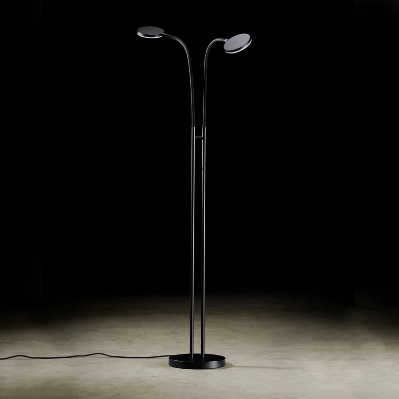 LED-golvlampa Flex Twin med 2 lampor och Flex-rör LED-golvlampan Flex Twin är perfekt som läslampa. Den har två ljuskällor med en rund stomme. Reflektorerna är svängbara tack vare inbyggda leder och är monterade på varsitt Flex-rör. Flex-rören utgår från de två smala, upprättstående rören och är mycket flexibla, vilket gör att de kan riktas in optimalt i olika lägen. Till exempel kan indirekt belysning skapas eller golvlampan placeras mellan två fåtöljer och varje person kan justera ljuset individuellt. Det finns en touchdimmer på var och en av de två rörlamporna. Det gör att ljuskällorna kan tändas och släckas oberoende av varandra. Den kan också användas för att dimma lysdioderna kontinuerligt. Håller du knappen intryckt längre ändras ljusstyrkan tills du släpper den igen. Flex Twin LED-golvlampans tidlösa, eleganta och samtidigt mycket moderna utseende gör att den kan integreras i nästan alla inredningsstilar.