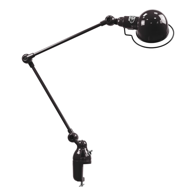 Signal SI332: tvåarmad bordslampa med skruvklämma - klämvidd max. 4 cm Denna bordslampa har inspirerats av Loft-lampan från 1950. Armaturserien Loft skapades av Jean-Louis-Domecqs. Han ville skapa en armatur som kunde flyttas helt fritt och ge största möjliga flexibilitet i ljusets riktning. Den robust byggda Loft blev en klassiker inom fransk industridesign. Bordslampan Signal SI332 är den mer känsliga versionen av denna klassiska armatur och, precis som alla Jieldé-armaturer, tillverkas den fortfarande omsorgsfullt för hand i fabriken i Lyon. Denna version har inte heller förlorat något av sin flexibilitet. Signal SI332 fästs enkelt på bordsskivan eller en hylla med hjälp av en integrerad skruvklämma. Det maximala klämområdet är 4 cm. Signal SI332 tänds och släcks med den lilla vippströmbrytaren på basen. De två lamparmarna kan vridas 300° vardera med hjälp av tre leder, hela armen kan vridas 280° i basområdet och lamphuvudet kan vridas 360°. Varje Jieldé-lampa är unik och märks som sådan med en numrerad skylt.