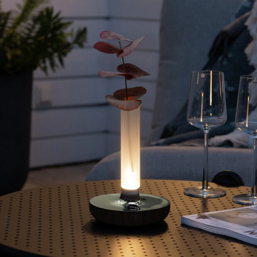 Biarritz - LED-terrasslampa och blomstervas med batteridriftDen dekorativa LED-lampan Biarritz är övertygande som ett lysande tillbehör för nästan alla miljöer. Diffusorn av frostat glas är monterad på det runda stativet av aluminium. Den är rörformad och vattentät, så att den kan fyllas med vatten inuti och användas som vas. I basen finns LED-ljuskällan vars ljus lyser uppåt och som av glaset försiktigt sprids till alla sidor. Växling och byte av ljusfärg sker via strömbrytaren under basen. Dessutom möjliggör en roterande metallring vid glasets bas en steglös dimning.- steglöst dimbar- färgtemperaturen kan ändras i 3 steg: 1 800 K, 3 000 K och 4 000 K- laddningsstation med USB-kabel ingår (för torr användning inomhus)- ljusvaraktighet per batteriladdning: 9 h vid 100 % ljusutbyte- skyddsklass: IP54