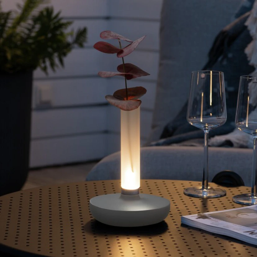 Biarritz - LED-terrasslampa och blomstervas med batteridriftDen dekorativa LED-lampan Biarritz är övertygande som ett lysande tillbehör för nästan alla miljöer. Diffusorn av frostat glas är monterad på det runda stativet av aluminium. Den är rörformad och vattentät, så att den kan fyllas med vatten inuti och användas som vas. I basen finns LED-ljuskällan vars ljus lyser uppåt och som av glaset försiktigt sprids till alla sidor. Växling och byte av ljusfärg sker via strömbrytaren under basen. Dessutom möjliggör en roterande metallring vid glasets bas en steglös dimning.- steglöst dimbar- färgtemperaturen kan ändras i 3 steg: 1 800 K, 3 000 K och 4 000 K- laddningsstation med USB-kabel ingår (för torr användning inomhus)- ljusvaraktighet per batteriladdning: 9 h vid 100 % ljusutbyte- skyddsklass: IP54