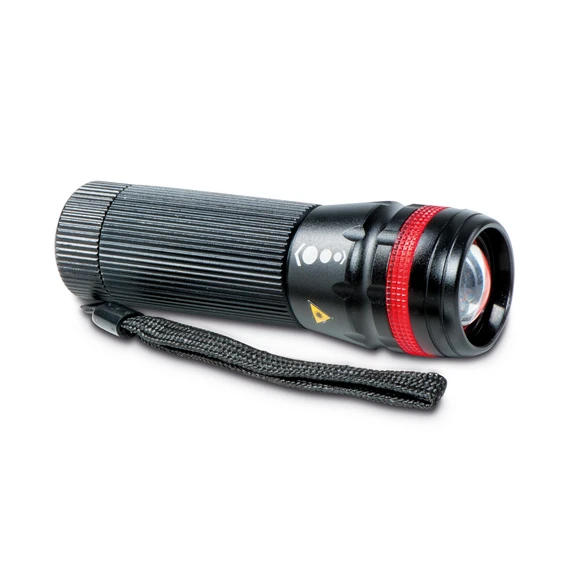 - Praktisk: Handrem ingår - Lämplig för utomhusbruk: Lämplig för utomhusbruk, stänkskyddad (IPX4) - Säker: Röd ljusring som syns från alla håll - Innehåller 3 x 1,5 V batterier (typ AAA) 1200 mAh - Variabel: Justerbar ljuskägla (zoomfunktion) för diffust närljus eller koncentrerat fjärrljus - 3 ljusnivåer: Ljusstyrka hög (100%), ljusstyrka låg (25%), stroboskopljus (ljusblixtar) för avvärjning av fara