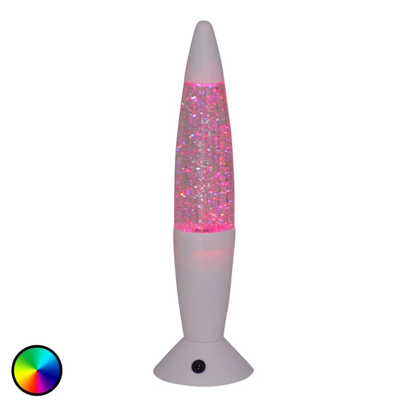 Denna LED-lavalampa sörjer för en fascinerande effekt Små metallplattor i rörelse skapar en glittrande effekt, medan olika färgade lysdioder får lampan att lysa i olika färger. På så sätt är lavalampan Glitter perfekt lämplig som sprallig dekoration i vardagsrummet och skapar en häftig atmosfär. Inklusive batterier (3 x AA).