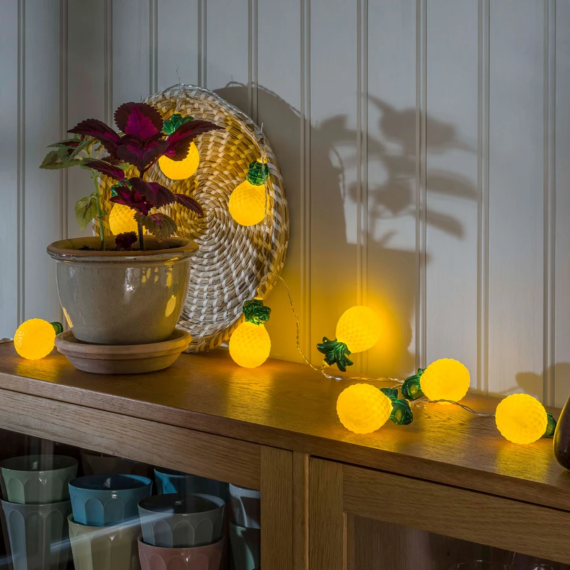 Den fruktiga, soliga dekorativa ljusslinga i ananas är utrustad med tio plastfrukter som innehåller varma vita lysdioder inuti. ljusslinga är subtil belysning och färgad dekoration samtidigt. Oavsett om det används på fester eller till exempel som ett riktat element i kök, fångar LED-ljusslinga ananas omedelbart. Den kan placeras var som helst eftersom den är batteridriven och utrustad med en praktisk 6-timmars timer.
