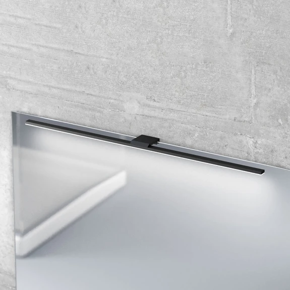 Modern LED-spegelarmatur Triga i svart för badrummetPå väggspeglar i badrummet är Triga den perfekta ljuskällan. Den smala, rektangulära designen och den monokroma finishen harmoniserar perfekt med moderna miljöer. Lysdioderna lyser nedåt bakom ett ljusspridande, satinerat skydd och övertygar med låg bländning. Armaturen monteras direkt på spegelns överkant - Skyddsklass: IP44 - LED-drivrutin ingår - Minskad bländning (UGR < 19)