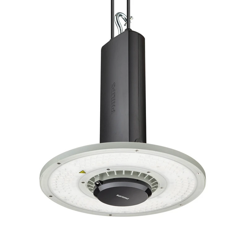 Högpresterande BY120P LED high bay spotlight, DALI, smalstrålande (55°) BY120P LED high bay spotlight från Philips CoreLine HighBay-serien ger effektiv belysning av produktionshallar och lagerlokaler med enastående energieffektivitet, som kan ökas ytterligare tack vare dess dimbarhet. Den består av ett hölje i grå aluminium och en kupa och har en förmonterad industrikontakt som gör den enkel att ansluta. BY120P är även utrustad med en krok för enpunktsupphängning, alternativt kan den ytmonteras med hjälp av ett fäste (ingår ej) - Inkluderar styrutrustning (PSD, DALI dimbar) - Strålvinkel: 55° - Omgivningstemperatur under drift: - 30 °C till + 45 °C - Skyddsklass: IP65 - Slagmotstånd: IK07 - Anslutningskabel (0,3 m) med 3-polig stickkontakt - Uppfyller IFS/HACCP-krav för livsmedelsindustrin