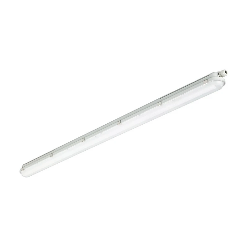 Våtrumsarmatur WT120C, DALI-dimbar, längd 151,5 cm WTC120C är en funktionell diffusorarmatur från Philips CoreLine Waterproof G2 LSC-serien, som är ett energibesparande alternativ till konventionella armaturer med lysrör. Tack vare sin strålsäkra och slagtåliga polykarbonatkonstruktion kan den användas i en mängd olika miljöer som tvättrum, källare, förråd, parkeringsplatser och verkstäder. I leveransen ingår konsoler för ytmontering och krokar för pendlat montage - Inklusive driftdon (PSD, DALI dimbar) - Ljusvinkel: 105° - Omgivningstemperatur under drift: - 20 °C till + 35 °C - Kapslingsklass: IP65 - Slagtålighet: IK08 - 5-polig snabbkontakt - Skruvbar kabelgenomföring