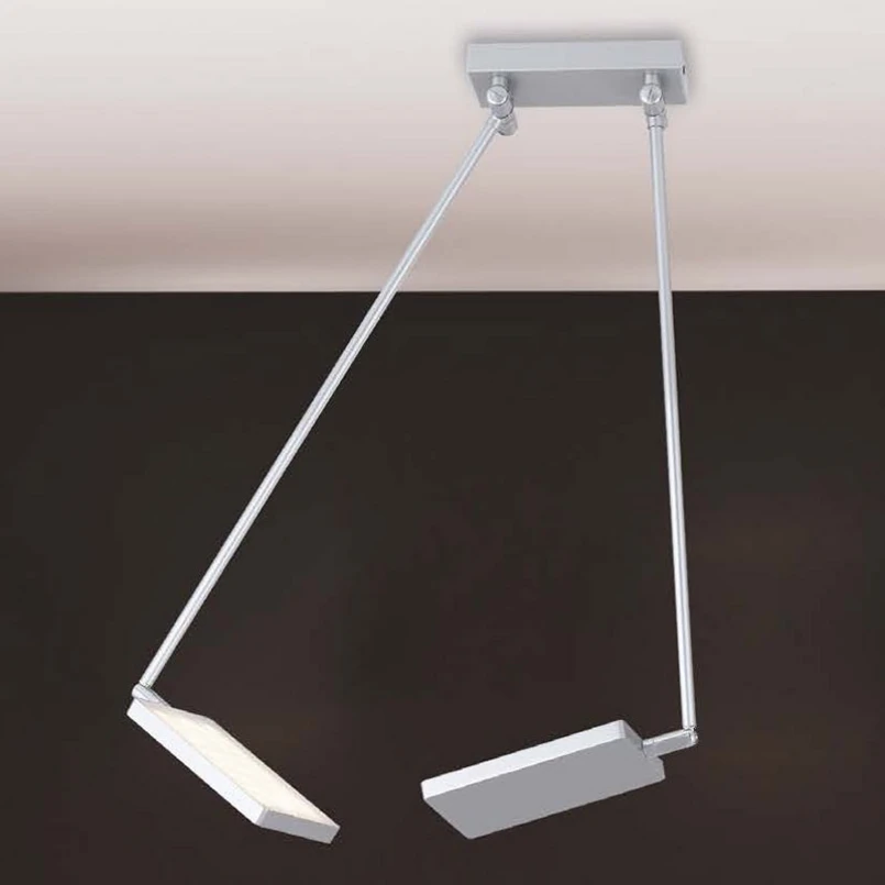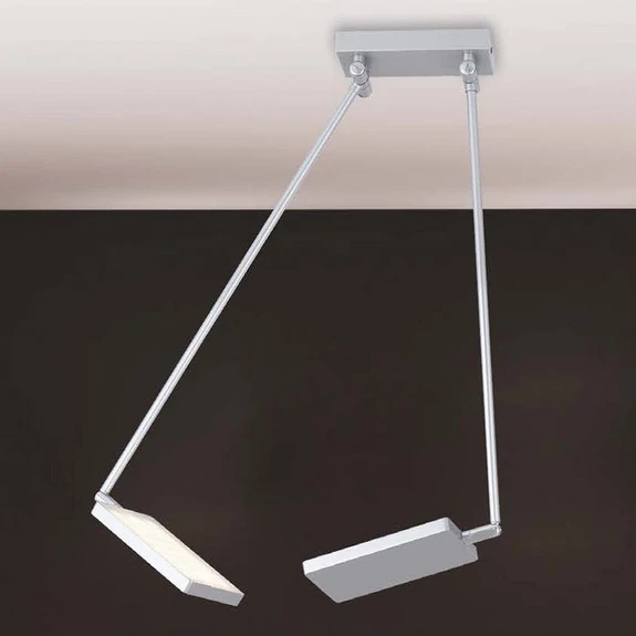 Multijusterbar Book LED-taklampa med två spotlights Denna funktionella design är ett verkligt flexibilitetsgeni. Book LED-taklampan består av en rektangulär baldakin på vilken två vrid- och vinklingsbara armar är fästa. De två armarna bär upp ett LED-element som också kan vridas och svängas och som är inneslutet i ett rektangulärt aluminiumhus. Tack vare de flexibla armarna kan belysningen ändras på många olika sätt och alltid anpassas till de önskade förhållandena. De diskreta elementen är knappt märkbara och passar till många olika inredningsstilar.