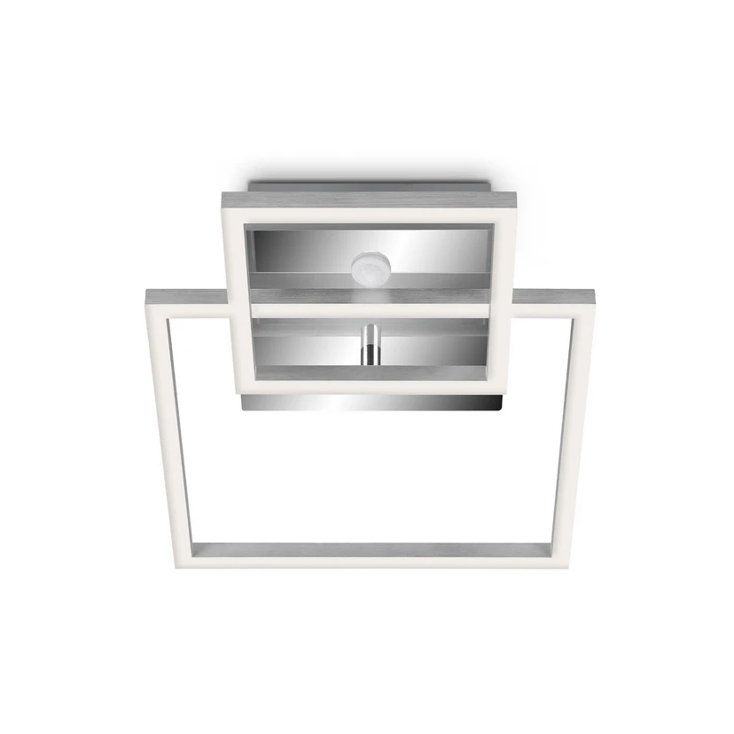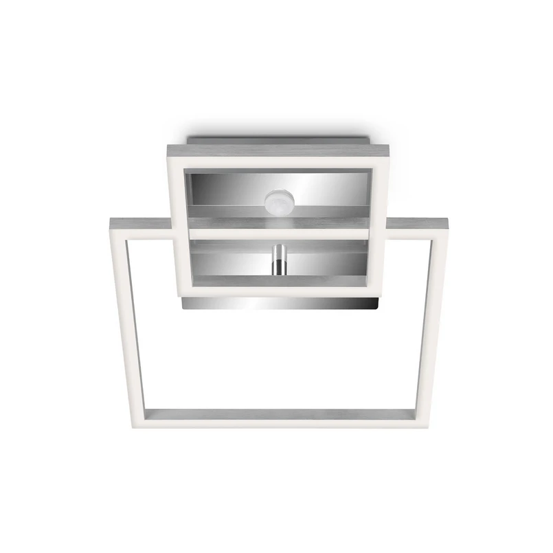 Modern LED-taklampa Frame med rörelsesensor, tvåflammig, aluminium/kromTaklampan Frame är en praktisk och anpassningsbar ljuskälla för modernt inredda vardagsrum och loungeområden. Taklampan i aluminium och krom är utrustad med två rektangulära ljuselement som kan roteras i ett horisontellt plan och rymmer de varmvita lysdioderna på undersidan. Utrustad med rörelse- och dagsljussensor för automatisk tändning.- Ljustid justerbar från 5 s till 8 min- inkl. kontinuerlig ljusfunktion- Detekteringsområde 6 m- Detekteringsvinkel 120°- Skymningströskel justerbar från 10 till 2.000 lx