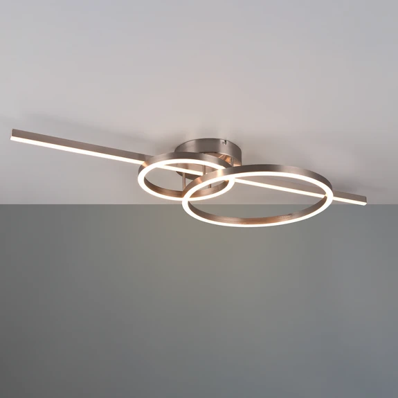 Modern LED-taklampa Montilla med tre ljuselement, ljusstyrka och färgtemperatur kan justeras med fjärrkontroll Taklampan Montillas design leker med raka och runda former. Under den runda baldakinen av metall är tre ljuselement placerade bland varandra - en lång bar, en liten ring och en stor ring. Med den medföljande fjärrkontrollen kan man tända och släcka, dimma steglöst och justera ljusfärgen (varmvit till dagsljus) eller välja ljusfärg i tre steg. En nattljusfunktion finns också tillgänglig.