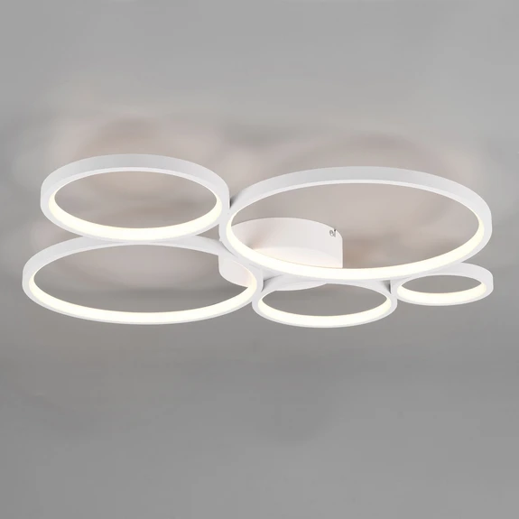 LED-taklampa Rondo med integrerad strömbrytare och dimmerTaklampan Rondo kännetecknas av sina fem ringar i olika storlekar som hänger från varandra. Den är därför ett riktigt blickfång inte bara när den är tänd utan även under dagen och fungerar som ett attraktivt dekorativt element utöver sin funktion som ljuskälla. Rondo är tillverkad i metall och passar med sin diskreta färgsättning och effektfulla design perfekt för moderna inredningar - t.ex. som armatur i vardagsrummet, hallen eller matsalen. Rondo har en integrerad brytardimmer som manövreras via en vanlig väggströmbrytare. Ljusstyrkan i de inre cirklarna regleras i tre steg så att ljusförhållandena när som helst kan anpassas optimalt till individuella behov och platsförhållanden. Det är möjligt att installera Rondo som en väggarmatur.
