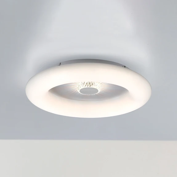 Separat kopplingsbara ljuskällor: Vertigo LED-taklampa med fjärrkontroll, CCT, dimbar Den eleganta Vertigo LED-taklampan i strålande vitt sätter nya standarder för stilfull interiörbelysning. Taklampan är utrustad med ett kraftfullt LED-kort som täcker ett brett spektrum från 2 700 till 5 000 Kelvin. Med CCT-kontrollen kan ljusfärgen anpassas helt efter dina önskemål och behov. Välj mellan varmt, mysigt ljus eller svalare, uppfriskande ljus - armaturen ger dig den perfekta belysningen för varje situation. De två ljuskällorna kan kopplas separat. Så att du bara kan belysa den yttre kanten eller det vackra kristalljusspelet i mitten av armaturen. Samspelet mellan ljus och gnistrande kristaller skapar ett unikt ljusspel som ger rummet en glamorös atmosfär. För bekväm styrning av taklampan ingår en praktisk radiofjärrkontroll (inkl. 2 x AAA-batterier). Med den kan du inte bara dimra ljuset kontinuerligt, utan även justera CCT-färgtemperaturen. Du kan enkelt anpassa belysningen efter humör och behov utan att behöva lämna din plats. Den strålande vita looken, den separata omkopplingen av den yttre och inre belysningen, det fascinerande kristalljusspelet och den praktiska fjärrkontrollen gör denna armatur till ett absolut måste för sofistikerade ljuskoncept.