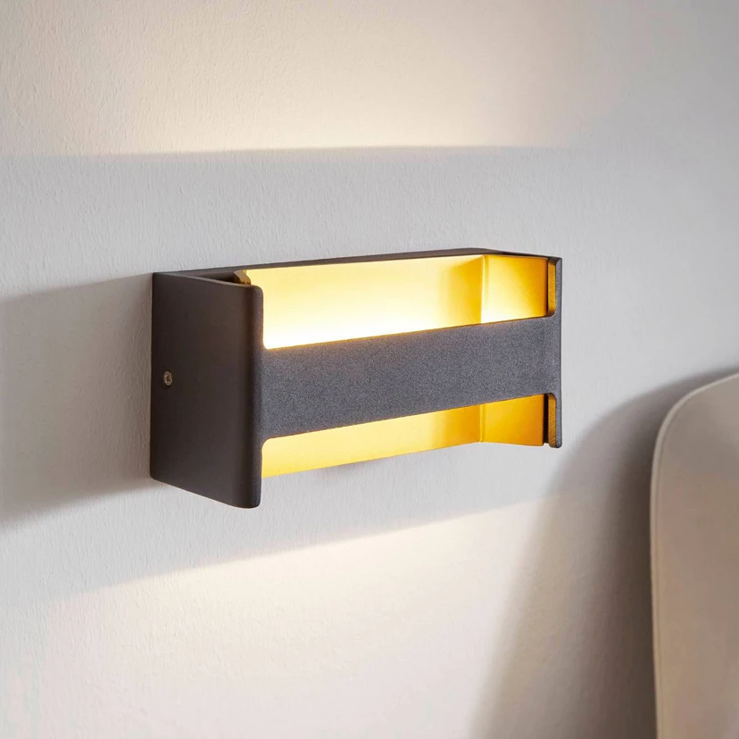 Vägglampan i aluminium och transparent plast fästs direkt på väggen. Det kuboida aluminiumhöljet hålls i tidlöst svart på utsidan och har en dynamiskt formad och guldförfinad inredning. Med rätt ljuskälla avger detta ett behagligt ljus som harmoniskt kompletterar levnadsmiljön.