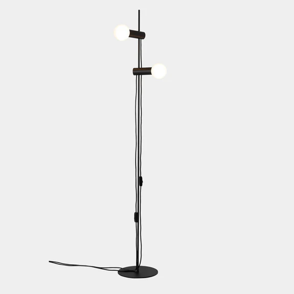 Golvlampan Nude Double med två lampor presenterar sig kreativt och modernt. Den är utrustad med två cylindrar i stativets övre del, som var och en har ett lampfäste och kan roteras horisontellt 360°. Tack vare att lampan är utformad utan skärmar, kan ljuset spridas obehindrat till alla sidor. Ramen med stativ och rund bottenplatta är svart.