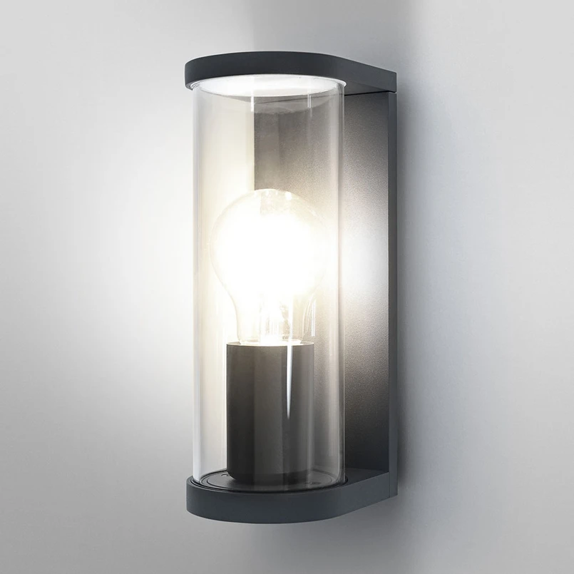 Mörkgrå Endura Classic Tubular utomhusvägglampa med klarglascylinder Endura Classic Tubular är en utomhusvägglampa med en tidlös design som passar på alla fasader. Armaturen består av ett väggfäste i aluminium i mörkgrå design, med utskjutande kurvor upptill och nedtill som utgör hållaren för den transparenta glascylindern inuti. En E27-sockel är placerad i mitten av glascylindern så att ljuskällan omges av glascylindern. Med en glödlampa (ingår ej) ser lampan mycket attraktiv ut. Ljuset lyser genom den transparenta glascylindern inte bara runt om, utan även uppåt.