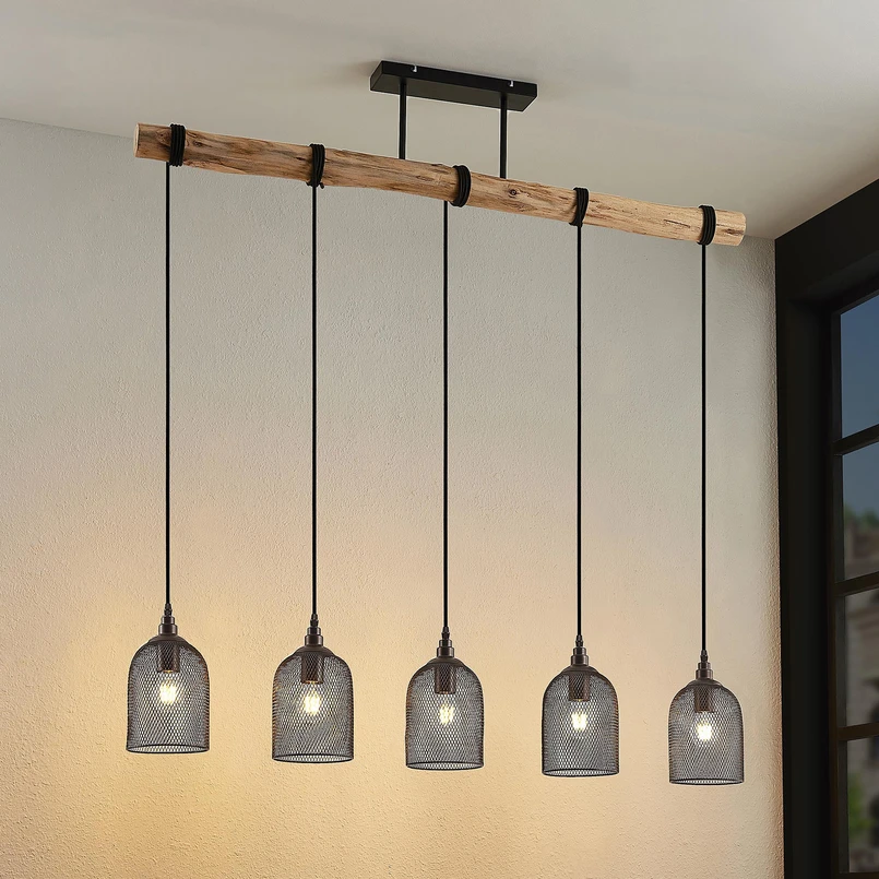 Dolcin hängande lampa med fem metallnätskärmar och träelement