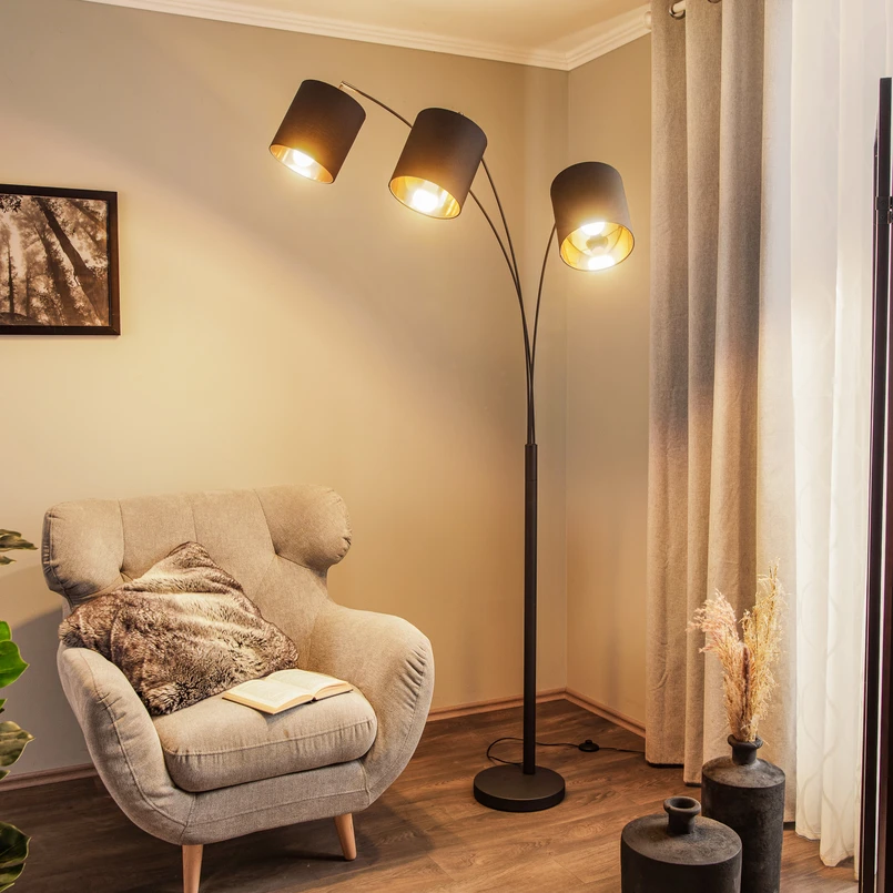 Svart Nanika golvlampa med tre cylindriska lampskärmar Nanika golvlampa är tillverkad av stål och har en svart ytfinish. Den har en rund lampfot som ger nödvändig stabilitet och tre svängda lamparmar som präglar designen. De cylindriska lampskärmarna i textil är också svarta på utsidan och har en överraskande varm gyllene färg på insidan, vilket skapar särskilt varma ljusaccenter i rummet. Denna golvlampa sticker omedelbart ut tack vare sitt mörka utseende och harmonierar mycket väl med moderna inredningsstilar. Perfekt som extra belysning i vardagsrummet.