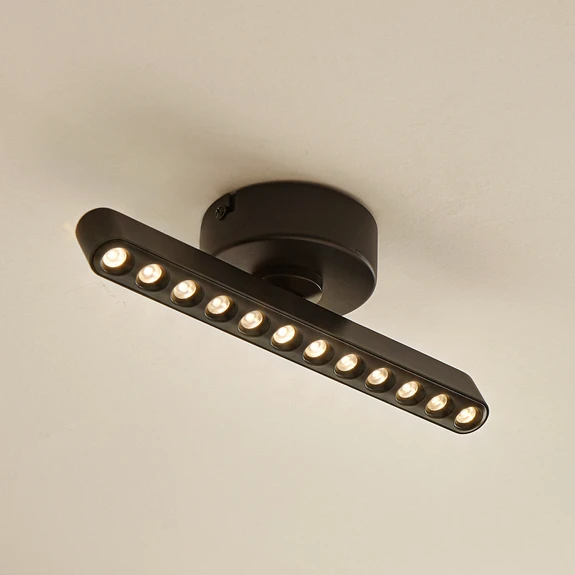 Svart Eldrin LED-spotlight i järn med praktisk dimmerfunktion Eldrin LED-spotlight kombinerar modern estetik med funktionell ljusteknik. Den moderna designen smälter sömlöst in i olika rumskoncept och är särskilt lämplig för vardagsrum, matplatser och korridorer. Lamphuvudet är rörligt och kan vridas 350° och svängas 90°. En väggbrytare gör att spoten kan tändas och släckas som vanligt. Tack vare 3-stegsdimmertekniken med integrerad avstängningsfunktion kan den dessutom dimmas till tre olika ljusstyrkor genom att trycka flera gånger på strömbrytaren: 100 %, 50 % och 10 %.