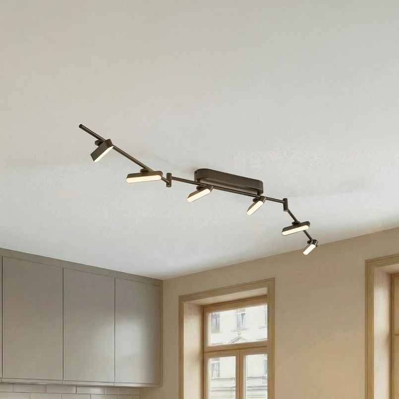 Eldrin LED-spotlight med 6 lampor i svart järn med dimmerfunktion Upplev ljusets förvandlande kraft med Eldrin LED-spotlight, som inte bara lyser upp rum med sin design med 6 lampor, utan också skapar atmosfärer. De integrerade LED-ljuskällorna ger en energieffektiv belysningslösning som är idealisk för vardagsrummet, matsalen och hallen. Med den medföljande dimmern kan ljusstyrkan justeras efter behov för att skapa allt från en lugnande till en stimulerande stämning. Sätt accenter med denna LED-spotlight och njut av ljusets fascination i ditt hem. En väggbrytare gör det möjligt att tända och släcka spotlighten som vanligt. Tack vare 3-stegs dimmertekniken med integrerad avstängningsfunktion kan den också dimmas till tre olika ljusnivåer genom att trycka på strömbrytaren flera gånger: 100 %, 40 % och 10 %. Eldrin lamphuvuden kan dessutom vridas 350° och svängas 90°.