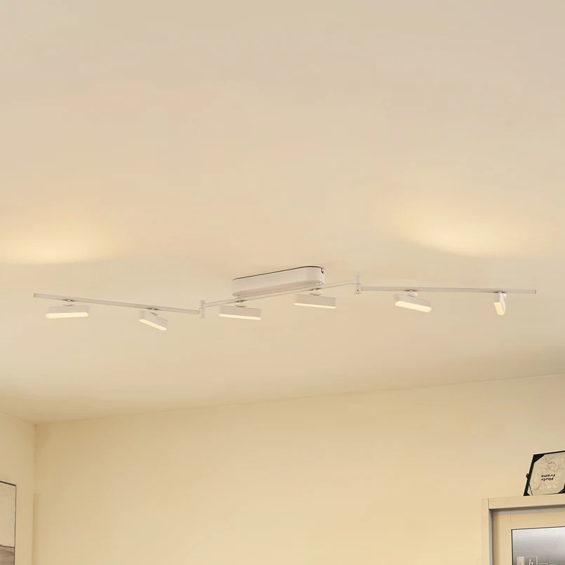 Vit Eldrin LED-spotlight med roterande och svängbara huvuden Upplev ljusets förvandlande kraft med Eldrin LED-spotlight, som inte bara ger vardagsrum, matplatser och korridorer en stämningsfull atmosfär med sina 6 lampor, utan också erbjuder en flexibel och energibesparande belysningslösning tack vare den integrerade LED-ljuskällan och den medföljande dimmern. Med möjlighet att justera ljusintensiteten efter behov skapar denna spot en atmosfär som kan vara både lugnande och stimulerande - perfekt anpassad till kraven i det aktuella rummet. En väggbrytare gör att spotlighten kan slås på och av som vanligt. Tack vare 3-stegs dimmertekniken med integrerad avstängningsfunktion kan den också dimmas till tre olika ljusstyrkor genom att trycka på strömbrytaren flera gånger: 100 %, 50 % och 10 %. Eldrin lamphuvuden kan dessutom vridas 350° och svängas 90°.