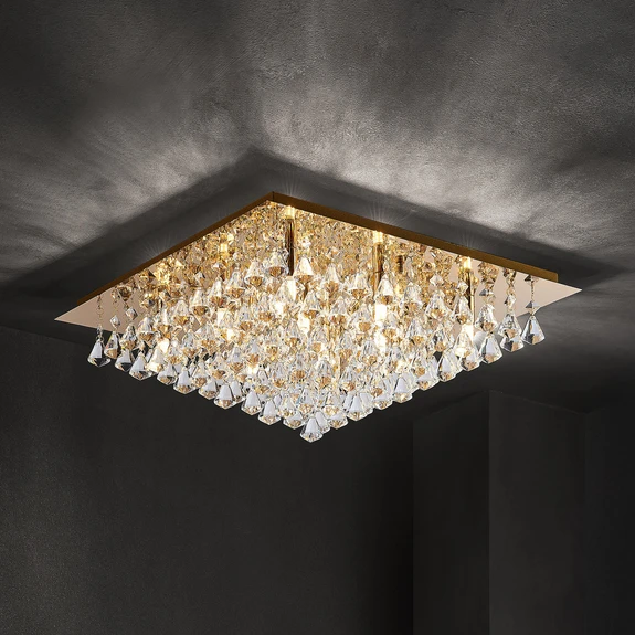 Den taklampa Rimedia kombinerar elegant K9 kristall och elegant stål. På det fyrkantiga takfästet i guldstål finns det många kristallelement som är förskjutna och tack vare sina olika längder skapar de en pyramid . Tolv uttag är placerade mellan kristallerna, i vilka var och en en G9-lampa kan sättas in och det genererade ljuset bryter igenom elementen och skapar en spännande ljusspel. Den mysiga atmosfären som skapas på detta sätt är perfekt för ett vardagsrum, men ser också bra ut i andra rum. Rimias taklampa ger varje tak det speciella och kan enkelt integreras i moderna inredningsstilar. Den harmoniska färgkombinationen av guld och transparent är attraktiv för ögat och sätter slående accenter i möblerna.